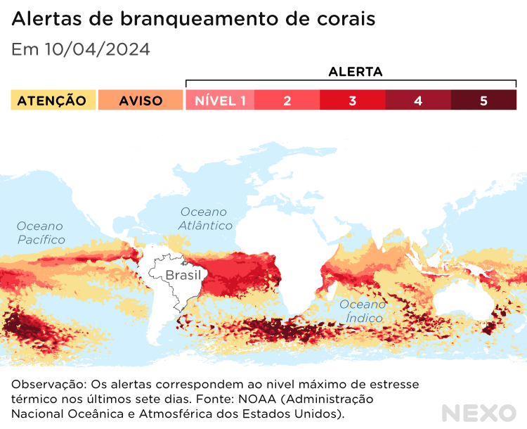 A Noaa afirma que a principal causa para o atual evento de branqueamento de corais são as altíssimas temperaturas registradas nos oceanos no último ano. A mudança climática é a principal responsável pelo fenômeno. Os anos de 2023 e 2024 também foram marcados pela presença do fenômeno climático El Niño, que afeta diretamente o mar, como o Nexo conta no vídeo abaixo: