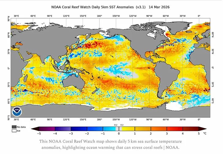 Peixes e lulas rareiam ou mudam de área. Aves marinhas perdem alimento, abandonam colônias e deixam de se reproduzir. Baleias, golfinhos e outros predadores também sofrem, porque falta comida na base do sistema. Mas um dos danos mais graves atinge os recifes de coral, um dos mais importantes berçários. Com o mar mais quente, cresce o risco de branqueamento, processo que enfraquece os corais, mata colônias inteiras e compromete abrigo, alimento e reprodução de inúmeras espécies. Num oceano já mais quente por causa da ação humana, o estrago pode ser ainda maior.